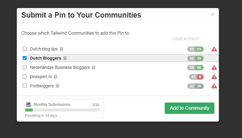 In die zin lijkt het een beetje op een Pinterest-groepsbord. Het handige aan communities is dat je veel beter kunt zien wie jouw pins deelt. Dat houdt Tailwind voor je bij. Daarnaast heeft de eigenaar van de community ook het overzicht hoeveel pins een lid deelt en hoeveel pins zij of hij toevoegt. Bij groepsborden is dit heel lastig bij te houden.