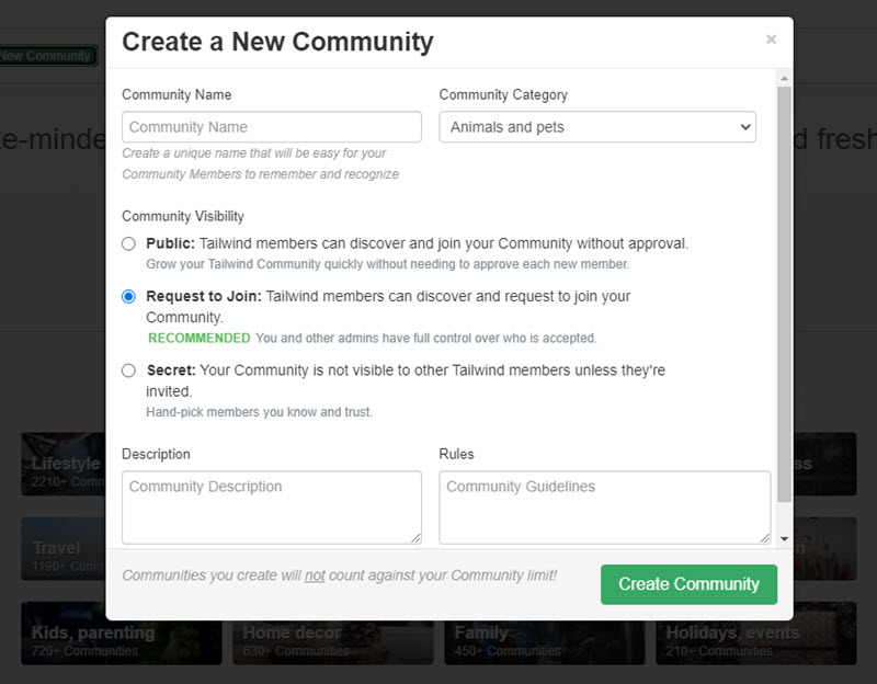 Misschien lijkt het je leuk om zelf een community te beginnen. Dat doe je door op de groene knop met de tekst Create New Community te klikken. Het volgende scherm zal dan verschijnen: